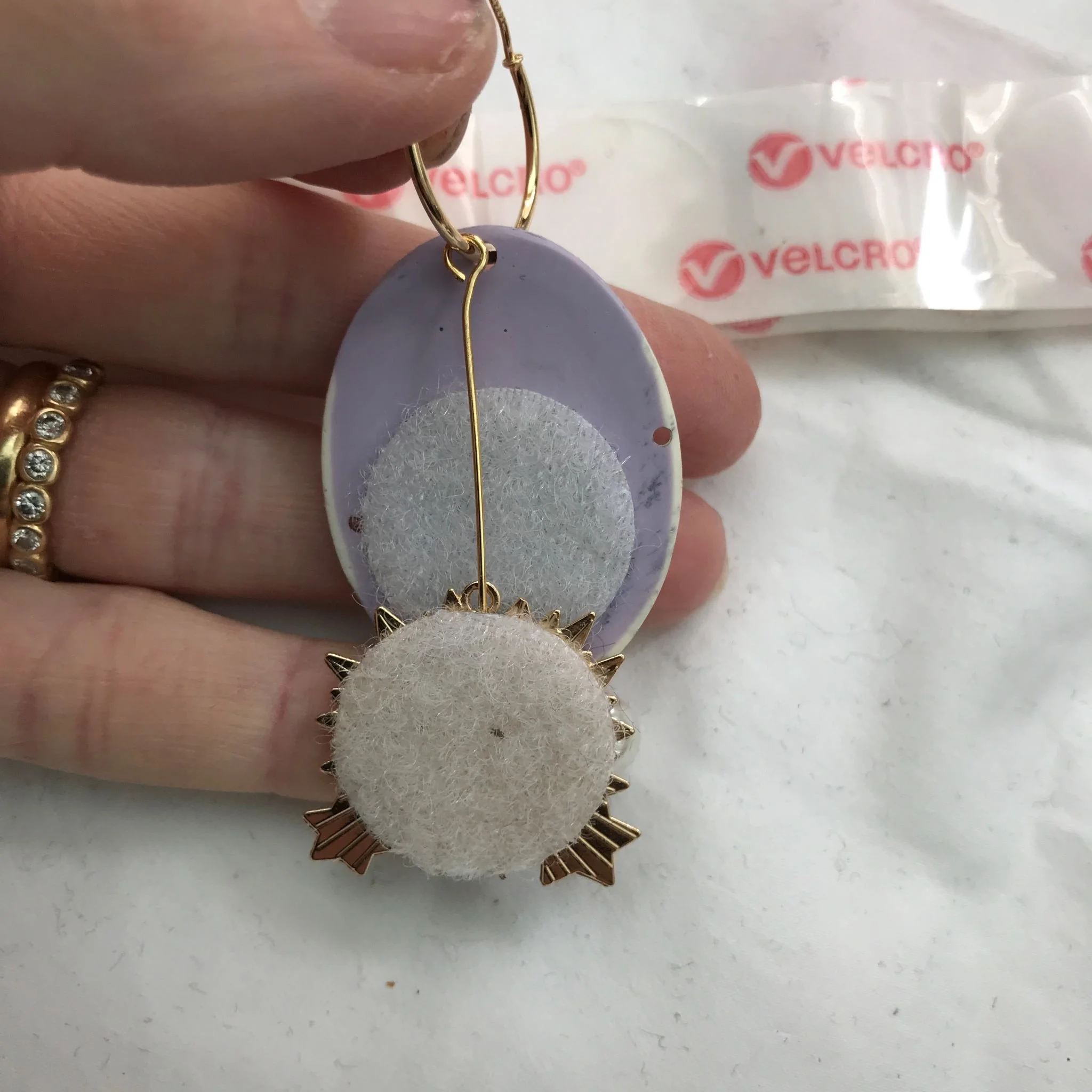 To gain some noise cancelling, I tried a few things, like decoupage fabric on the back of the ML & blobs of PVA on the back of the Kevin plus lovely chain attachments on both Kevin & pearls and felt patches between the ML & Kevin. It all worked-ish but I didnt really want them. I liked the chain but it was fussy work that took time, and the other two things weren’t right anyway, so time for another idea.