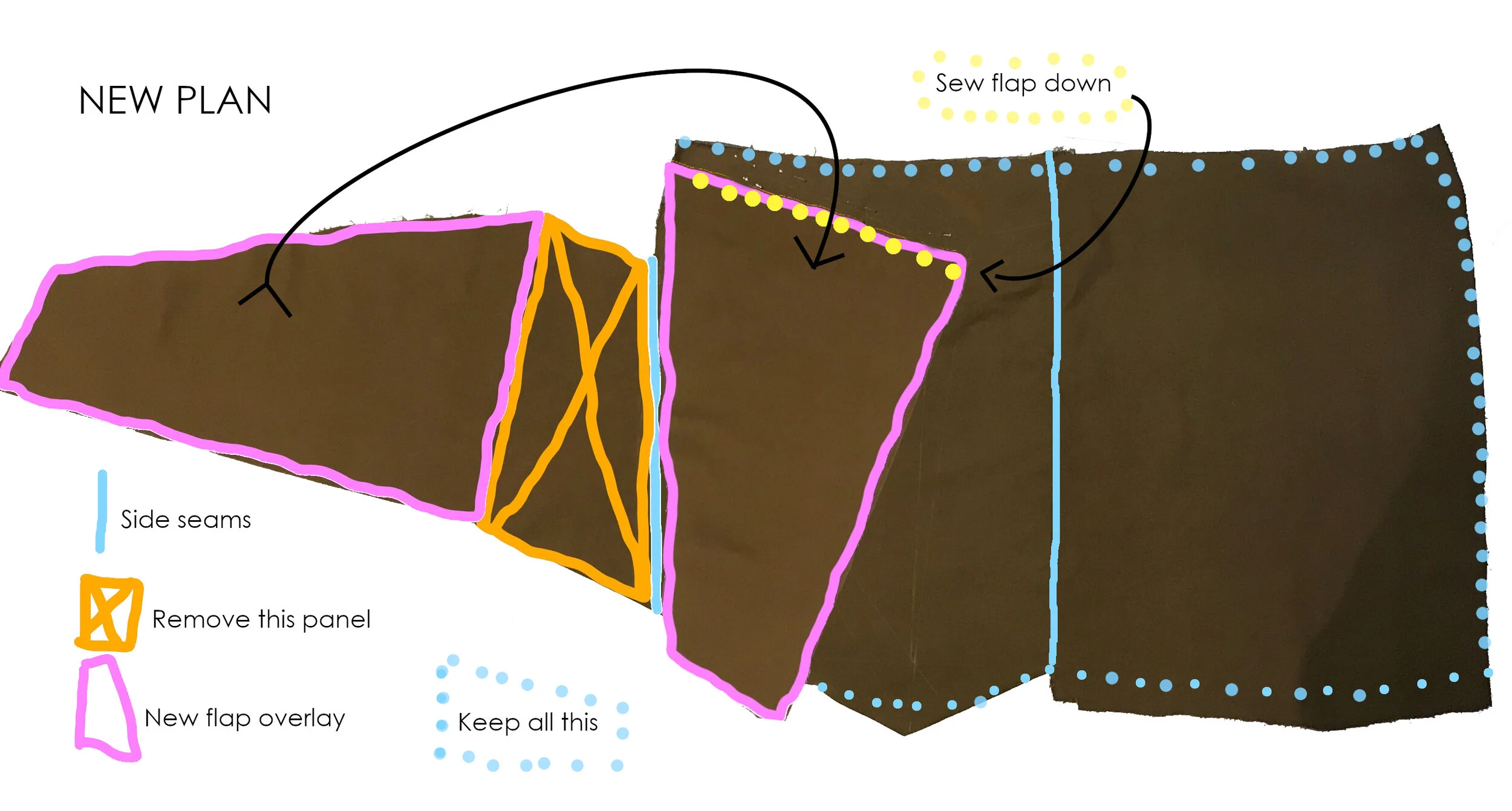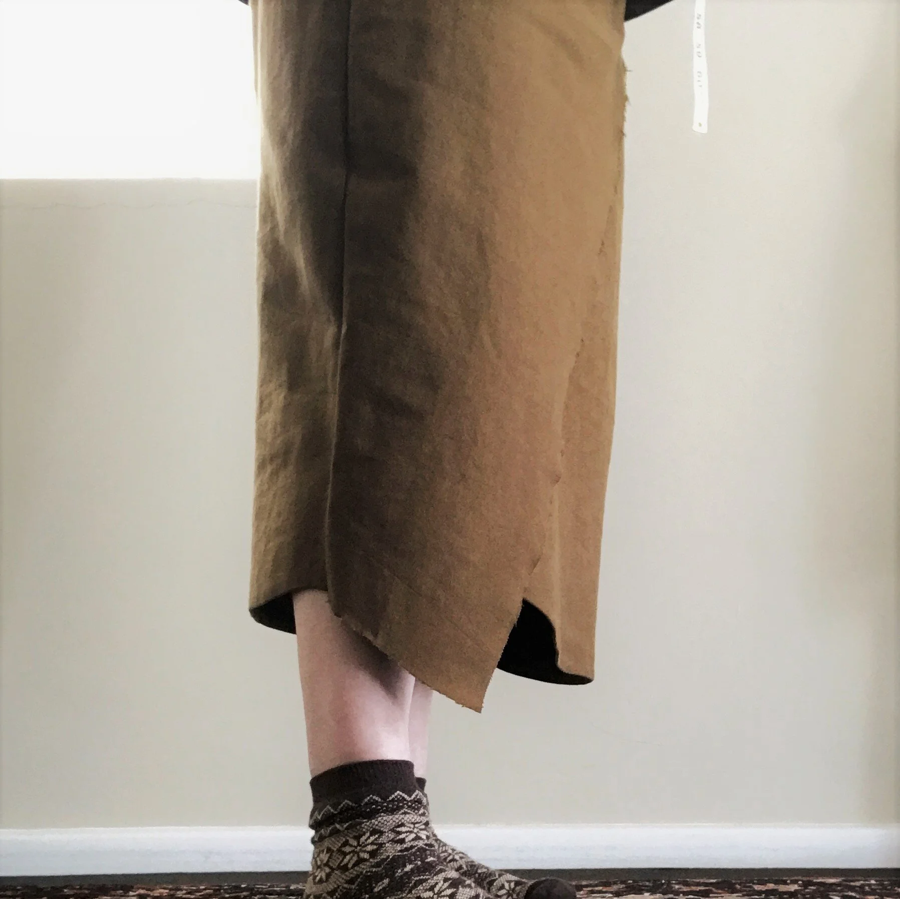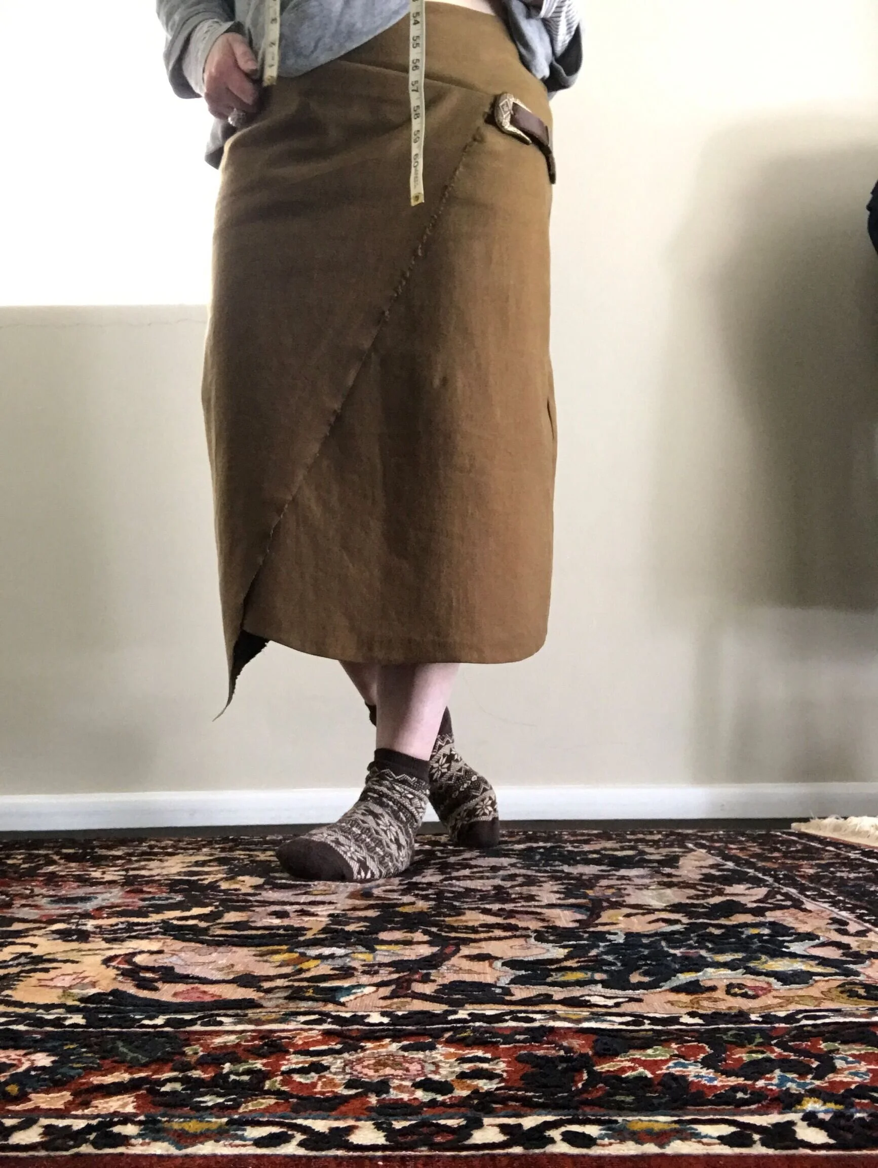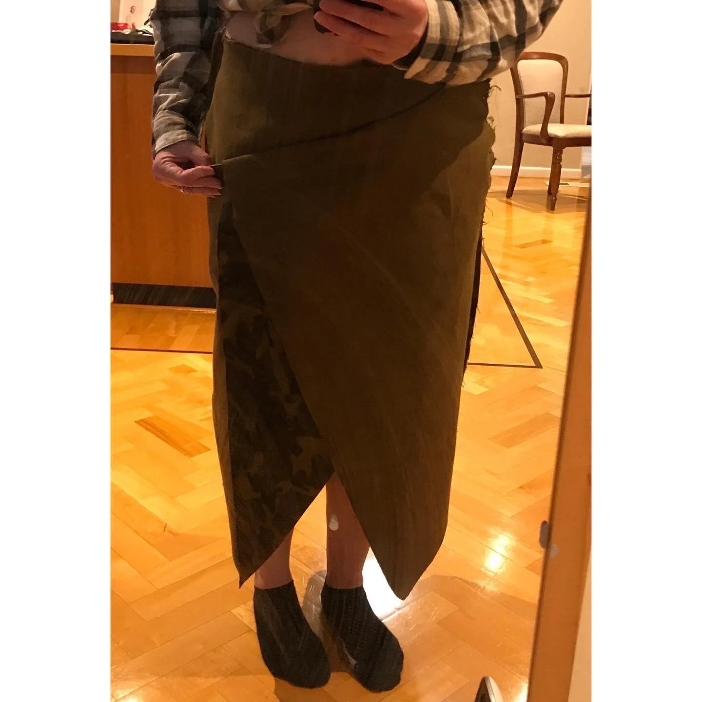 And so to a simple transition: remove the under-fold panel, retaining the top angular ‘flap’ to make it a faux-wrap skirt to accommodate the belt & buckle coming from underneath because I love them. And a new kind of fold + buckle skirt would be mine!