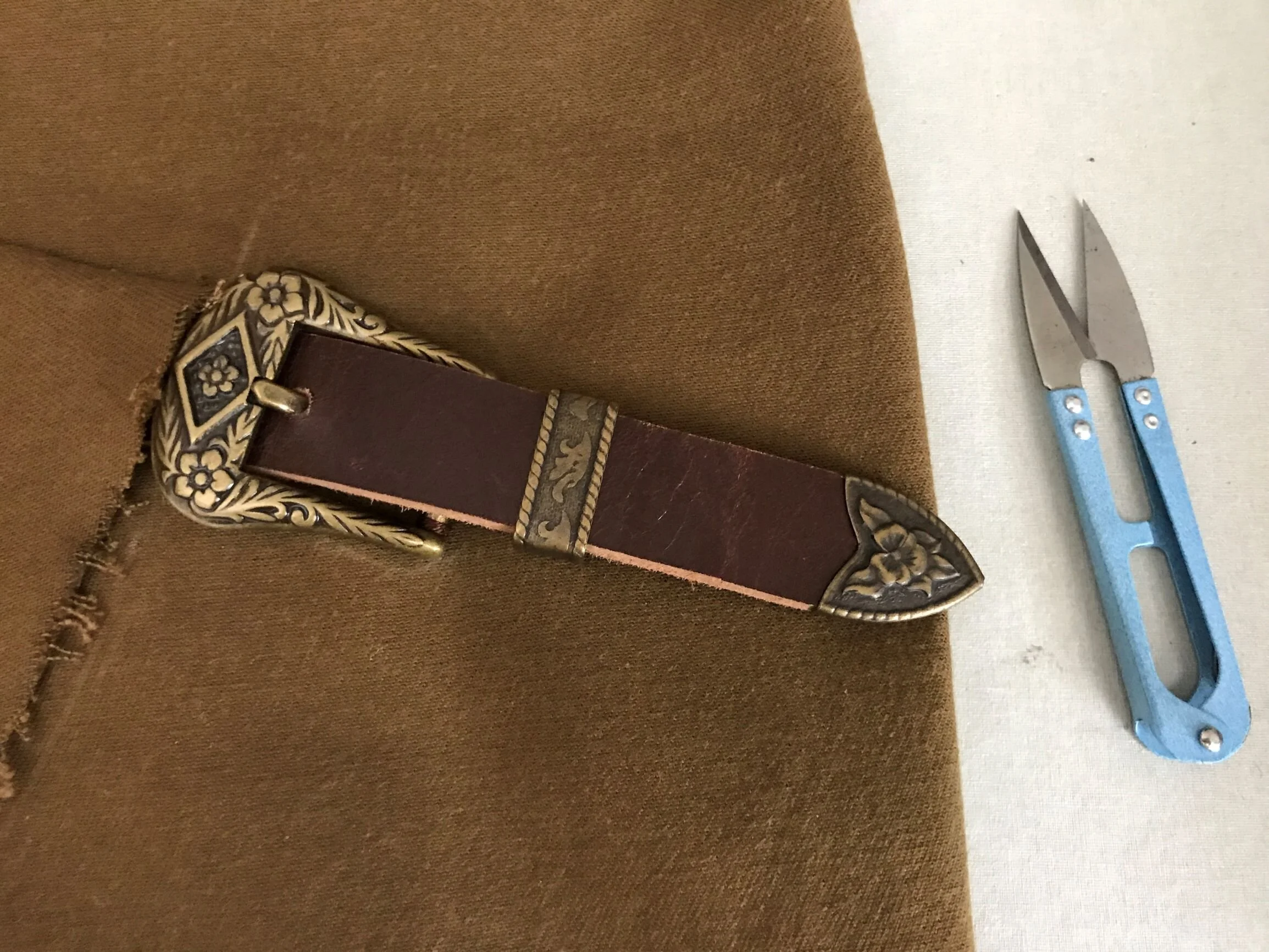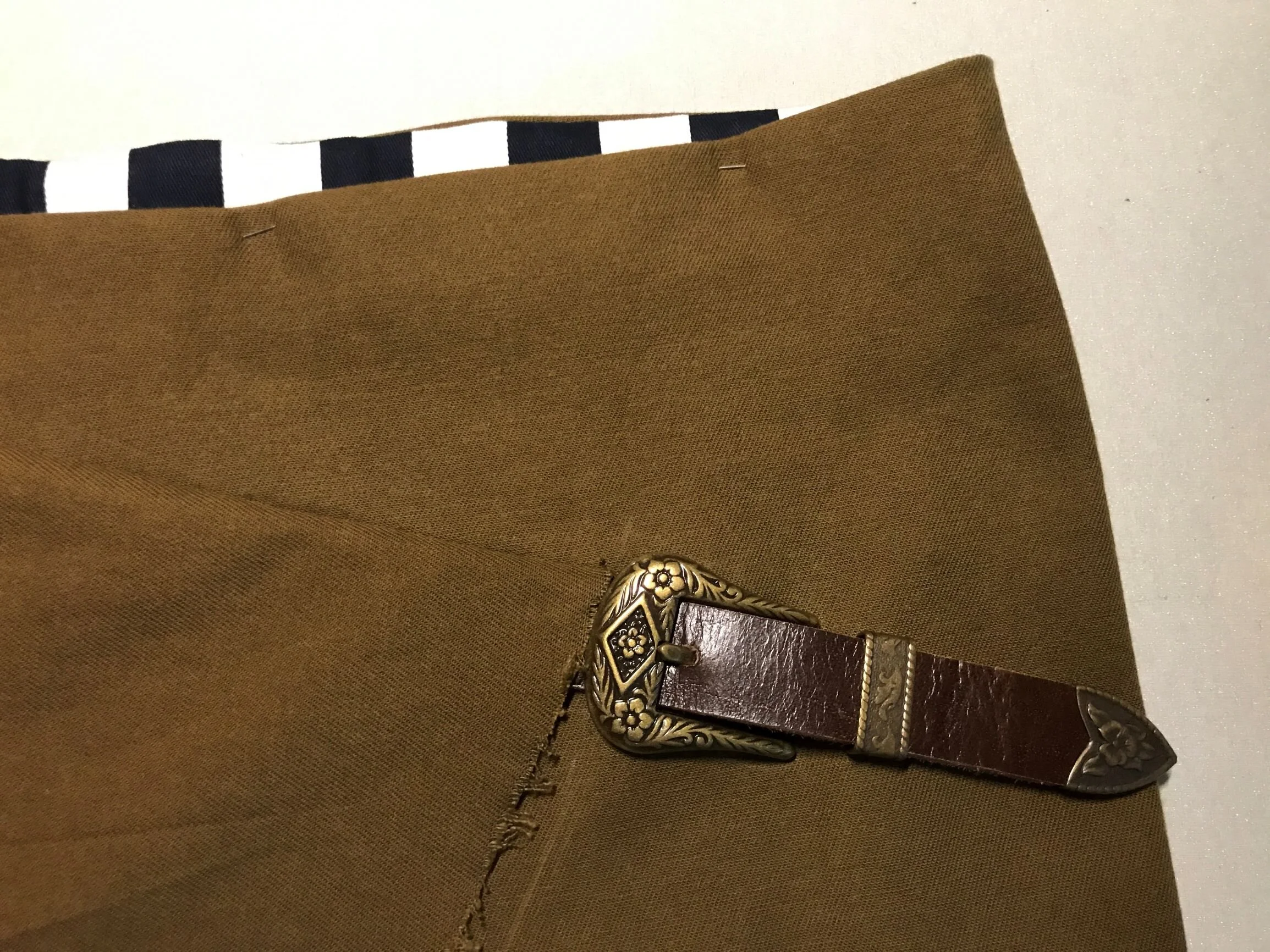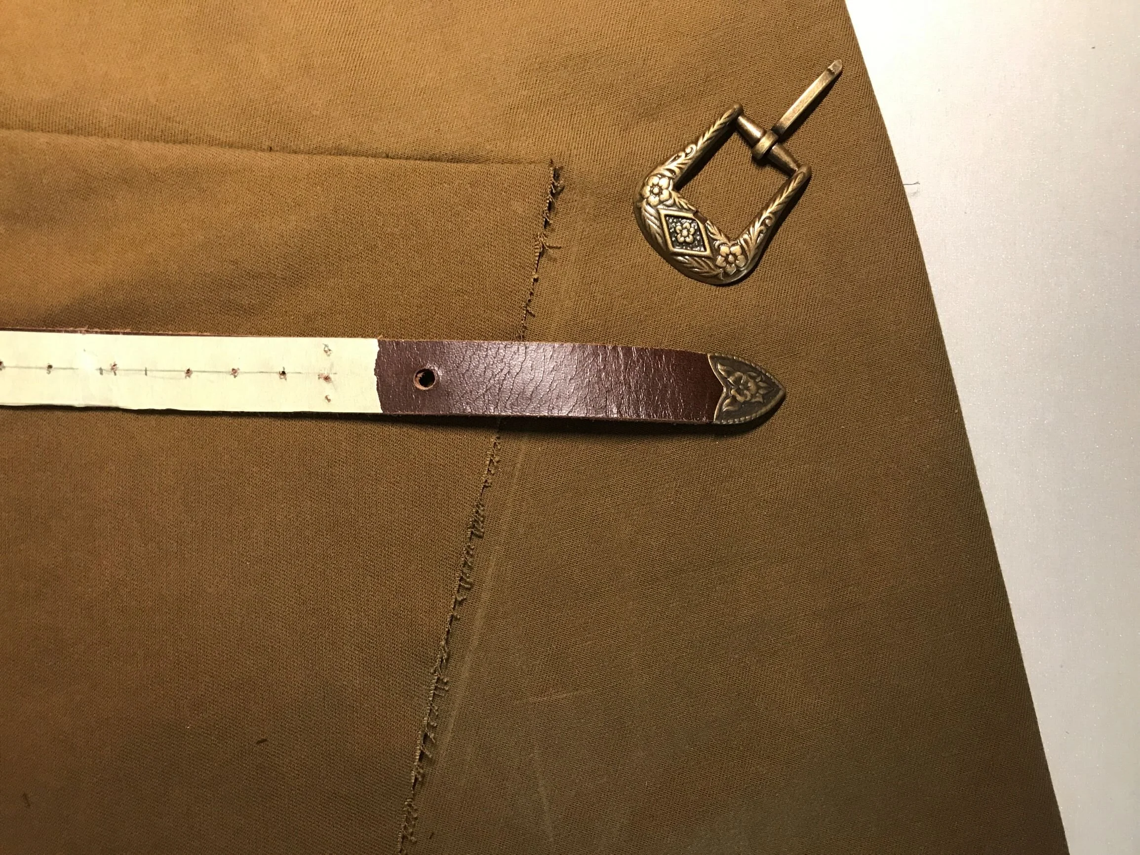 Getting closer to the exciting belt bit! The buckle should be positioned up against the edge as if it’s keeping it in place while allowing a nice belt tail left to nearly reach the side seam, with a keeper to be sewn on afterwards.