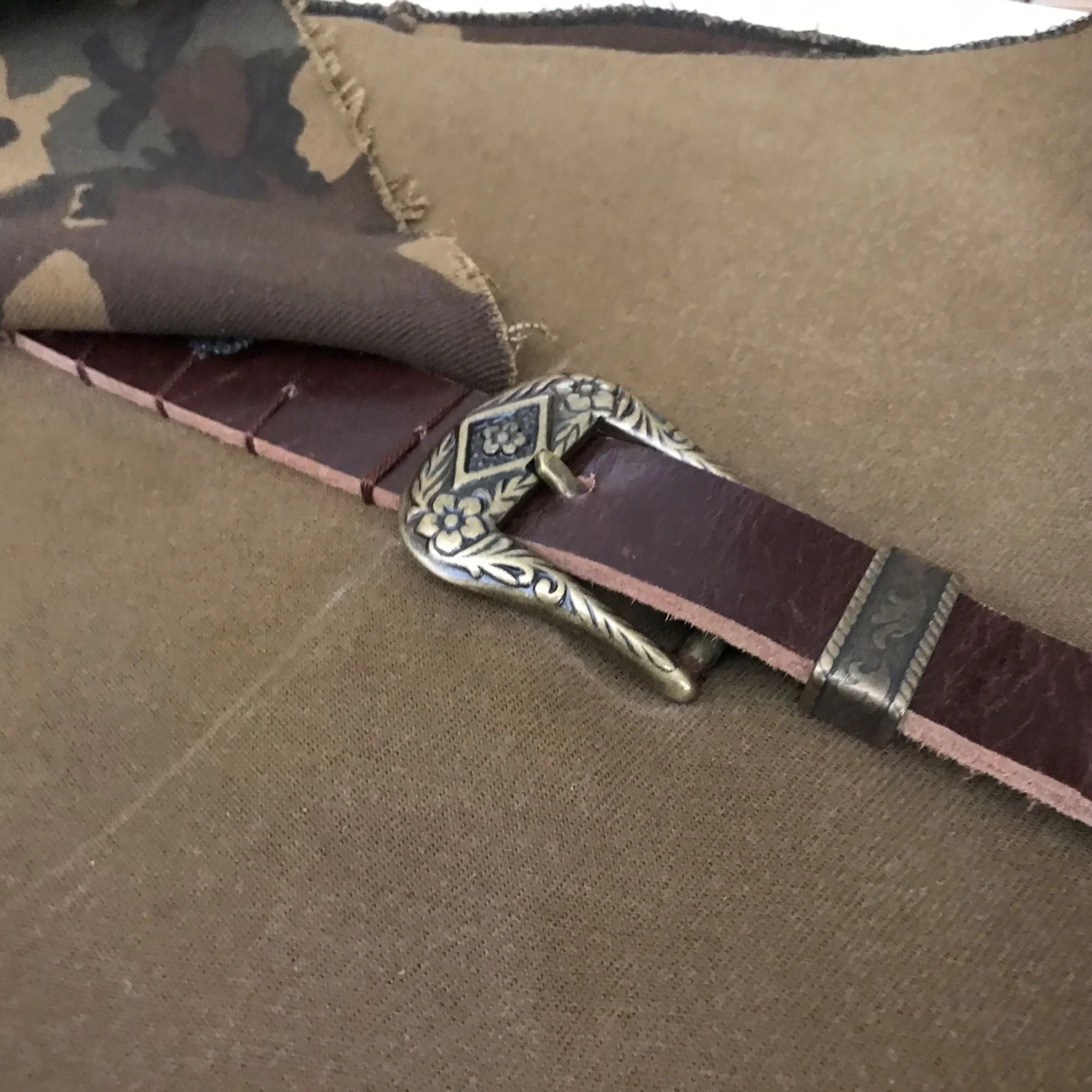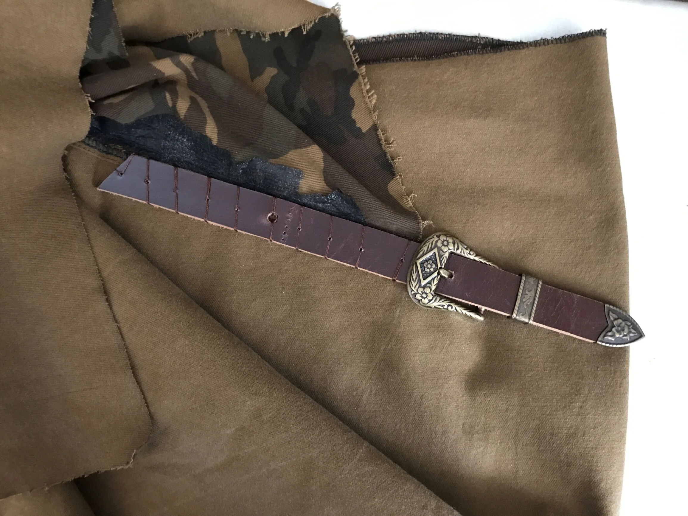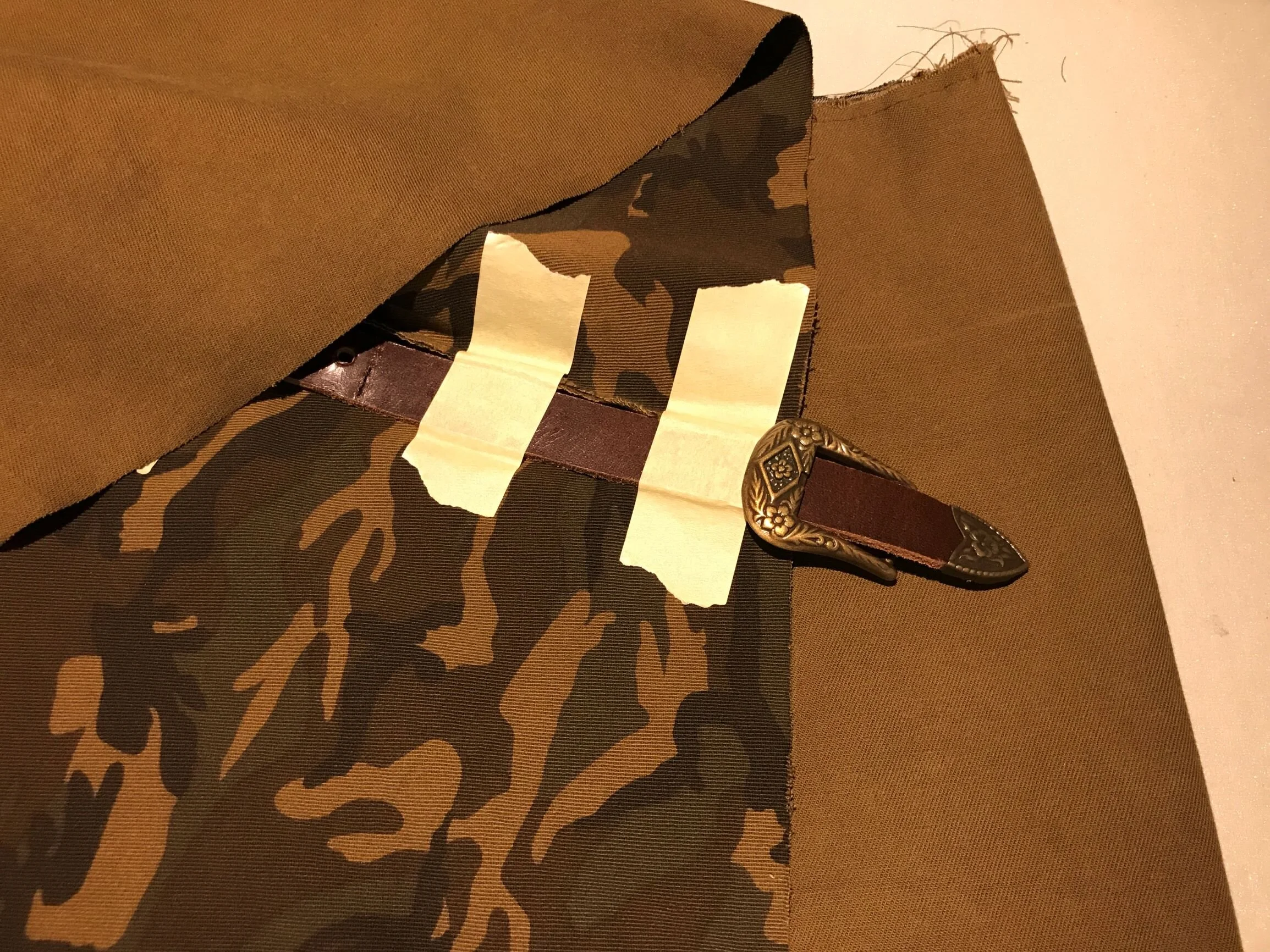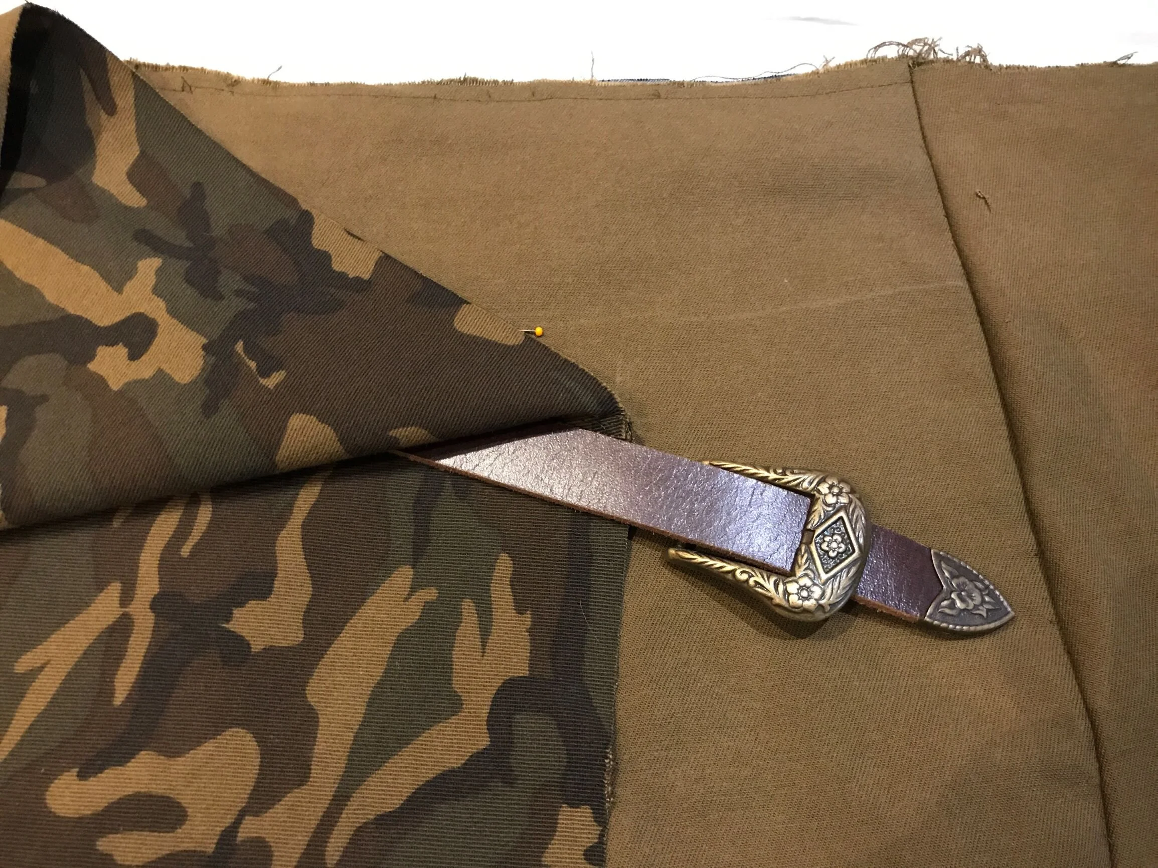 Getting closer to the exciting belt bit! The buckle should be positioned up against the edge as if it’s keeping it in place while allowing a nice belt tail left to nearly reach the side seam, with a keeper to be sewn on afterwards.