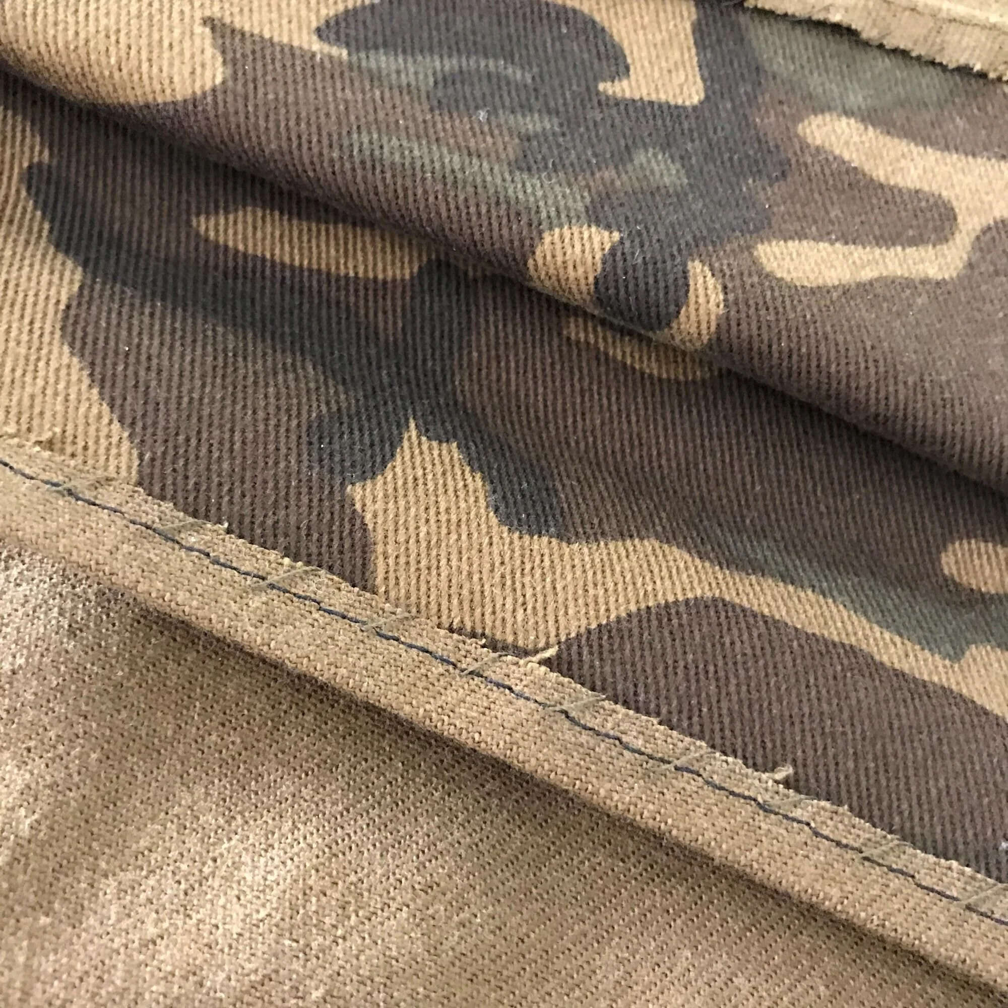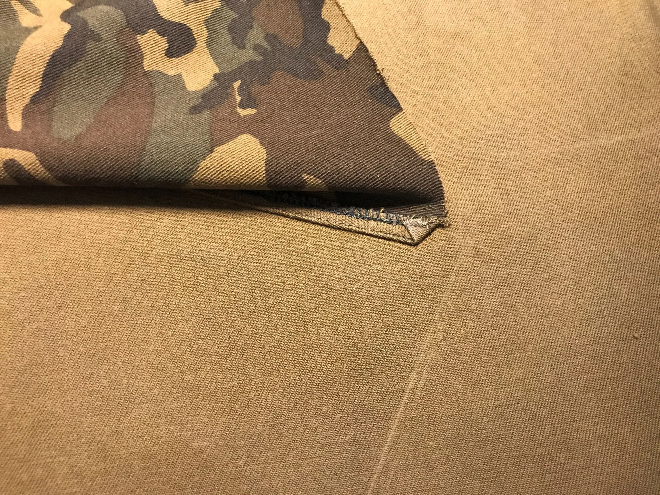 I bought several meters of this stretch cotton drill when it was on sale from the Fabric Store a few years ago, because of the lovely olive green on the wrong side (not keen on the camo) and because it has a really soft handle and is very stretchy & rather heavy. It’s colour, coincidentally, matches that of a previous buckle related inspiration….