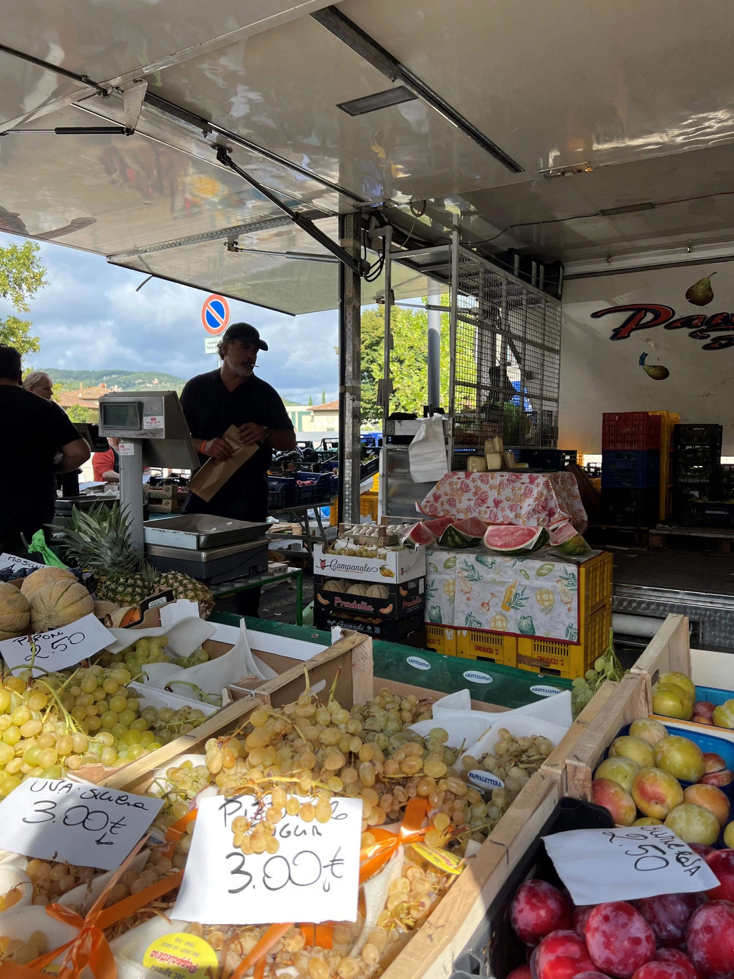 The produce market in Greve, near where our friends live. I bought strawberries and pears and melon for a butter-crust tart with mascarpone, and plums for a short-crust galette with thyme and vanilla bean. Both so good!