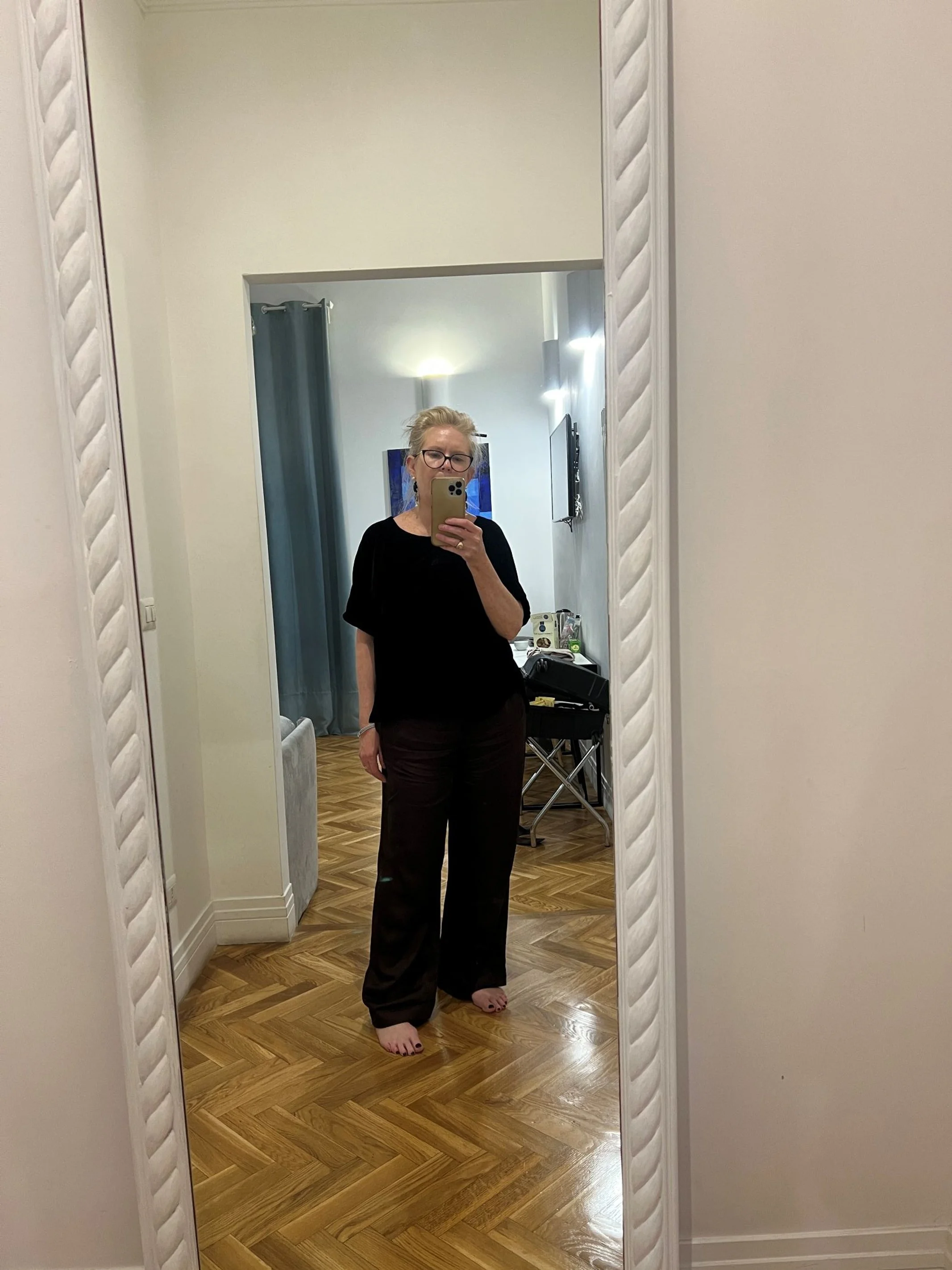 Barry pants the night before we left for Italy in a beautiful black textured cotton sateen that I’d had for ages. Then what happened was, I was back home in the studio, accidentally wearing these pants, when I sat on the floor to do something except the floor had some uncatalysed epoxy resin on it. Therefore I need to make more Barry pants/ continue exploring the Robbie pants design