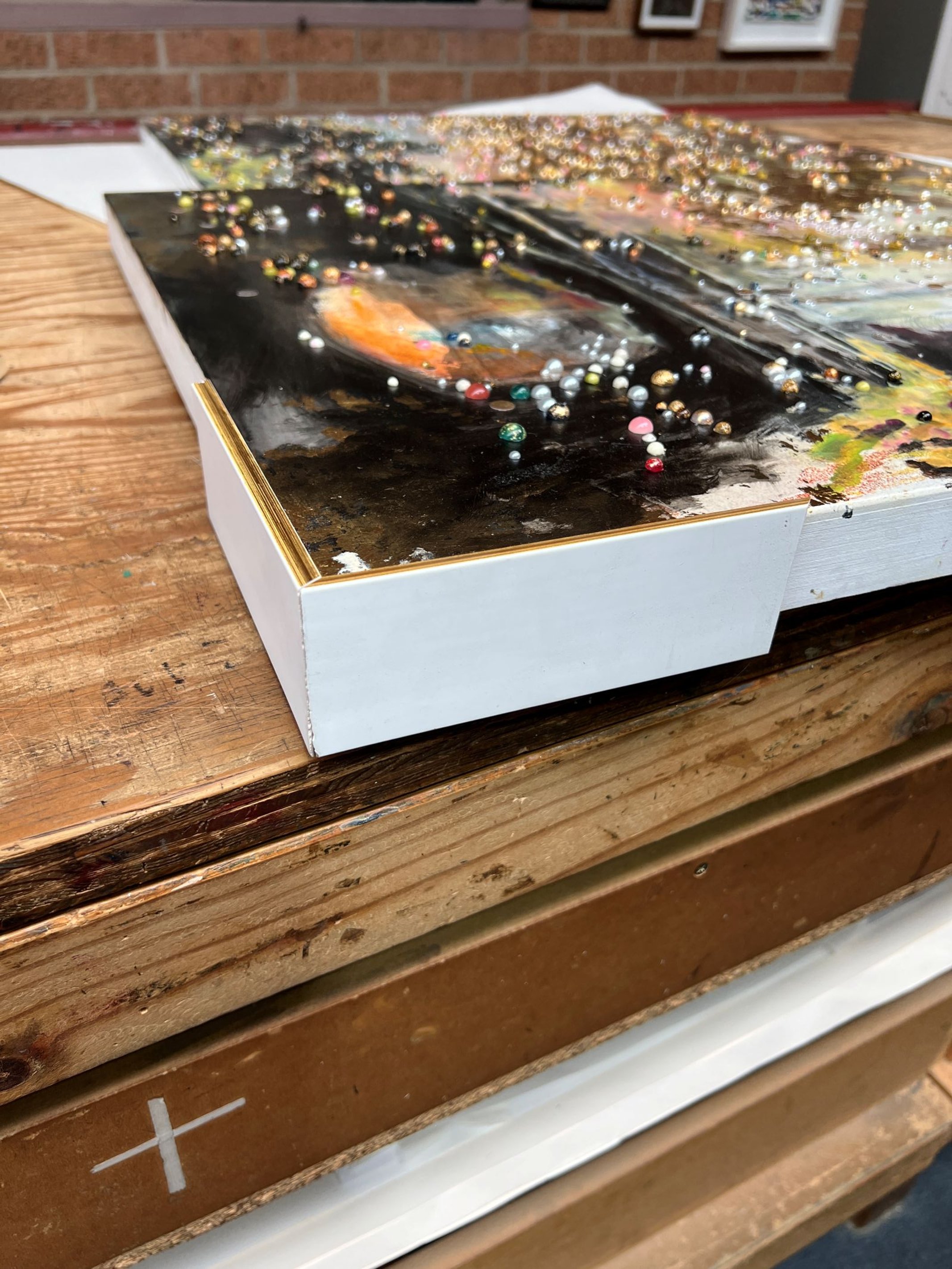 I estimate maybe 10+ layers of leaf went on. I’m experimenting with alternatives to gold size and its a whole new hobby. The crunchy was finally building up
