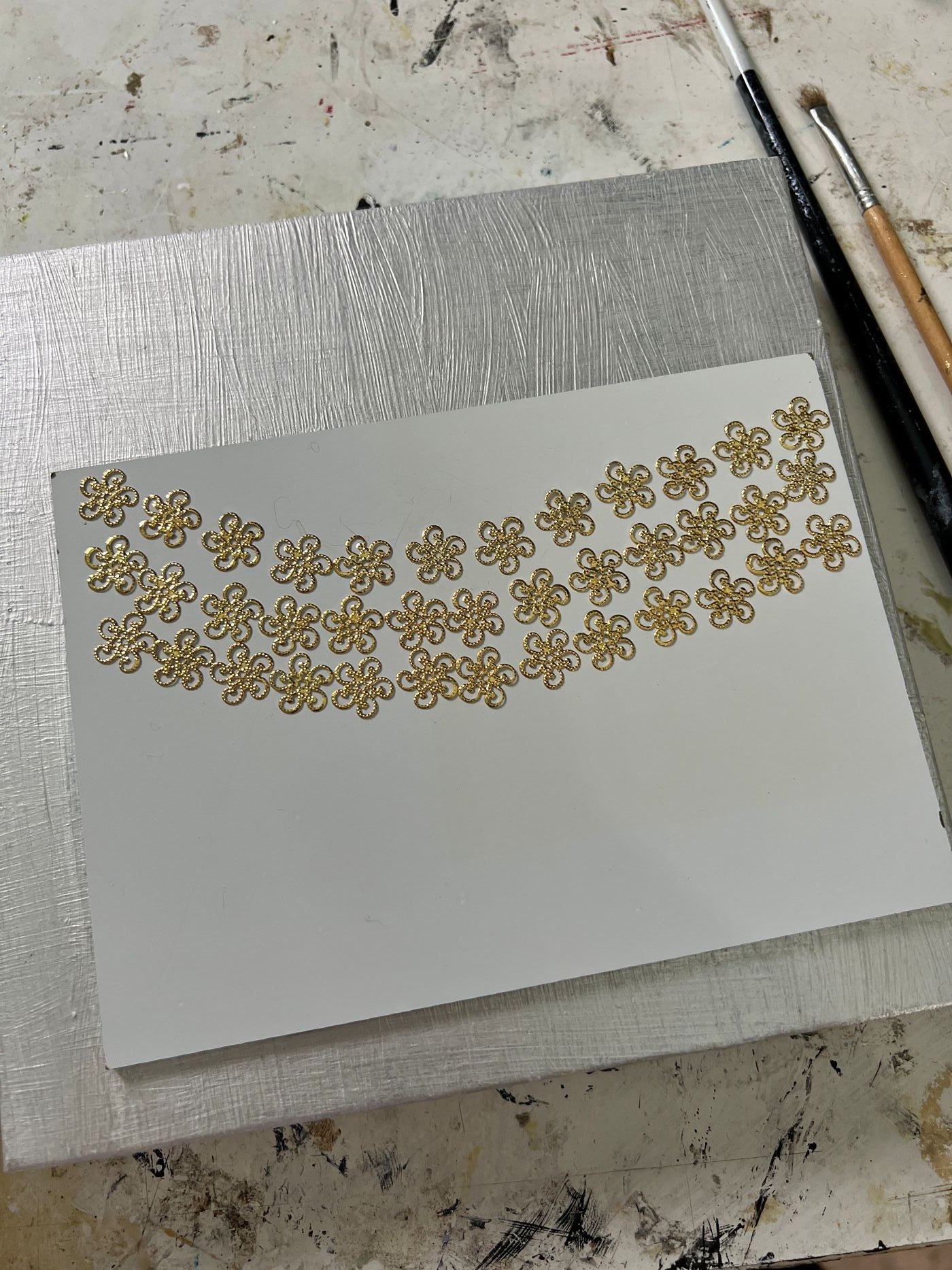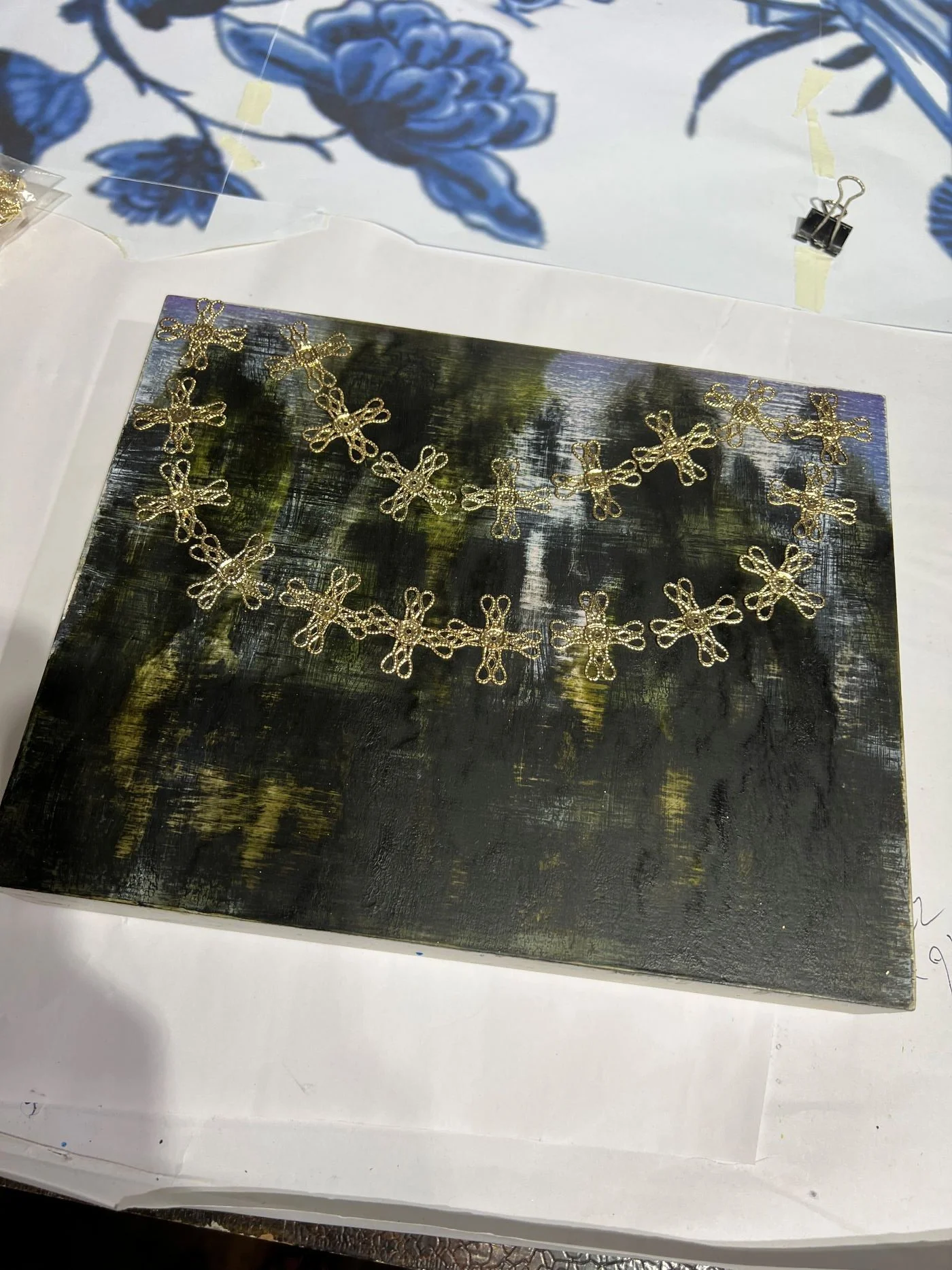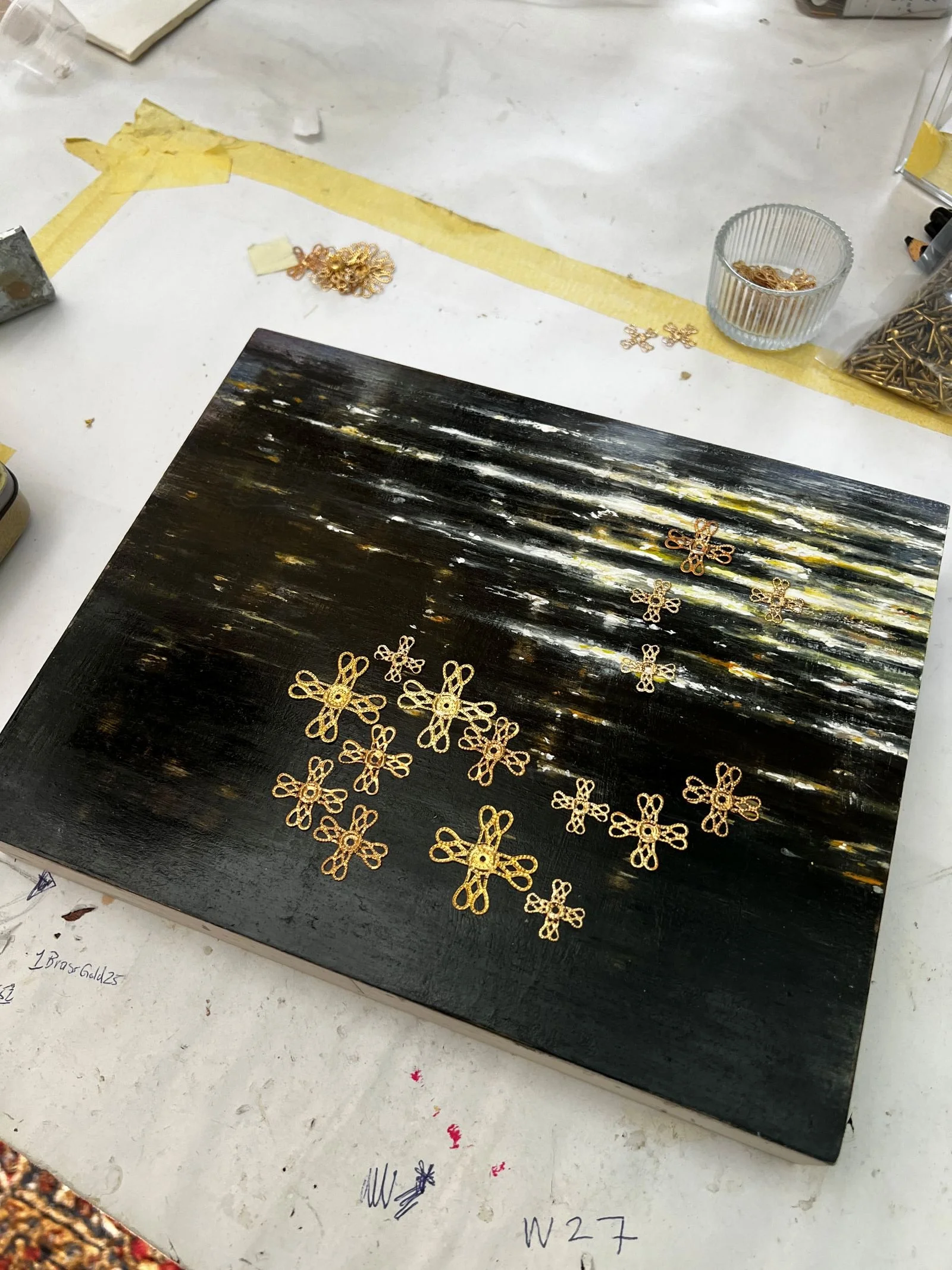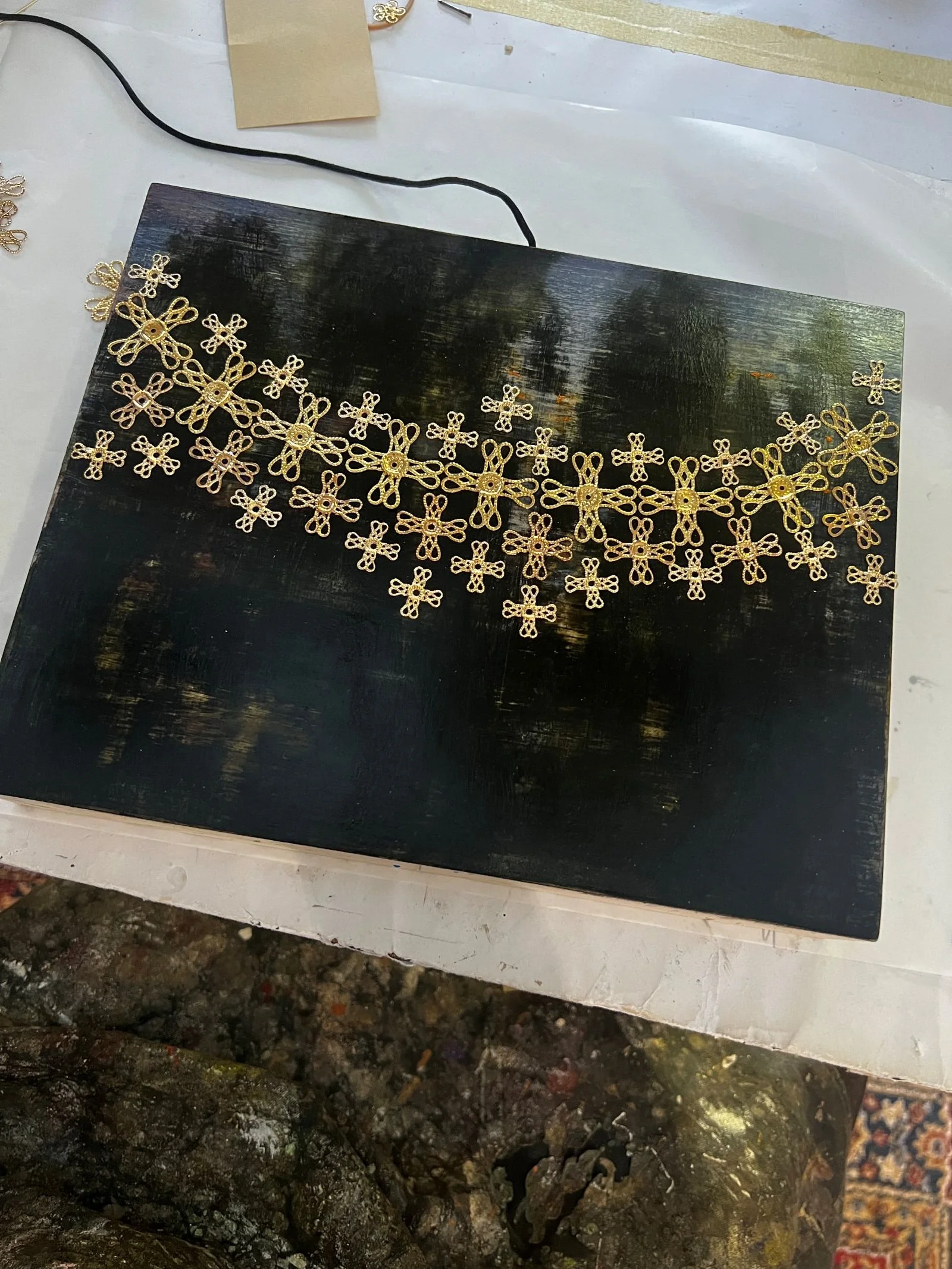 I don’t know but I have shifted the whole configuration of the studio, which was largely set up to make my beautiful products and I have bigger artworks in progress. Below is one piece I systematically destroyed which was great. It was an awful painting but breaking focus on jewellery in a flamboyant manner
