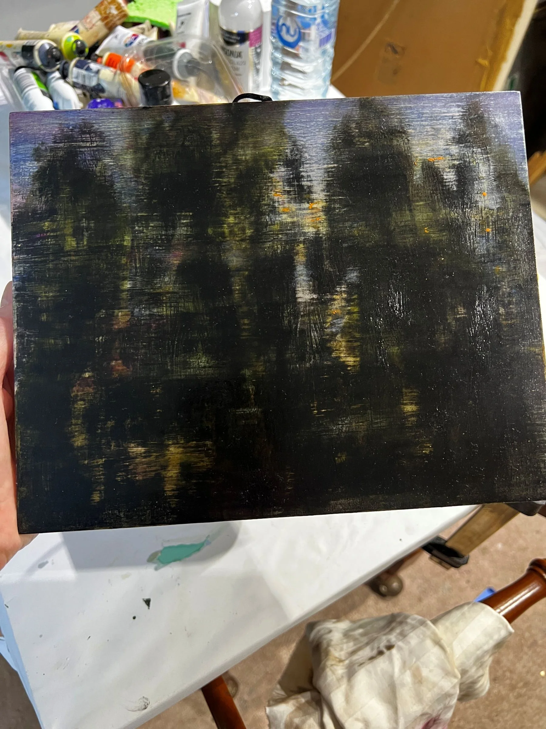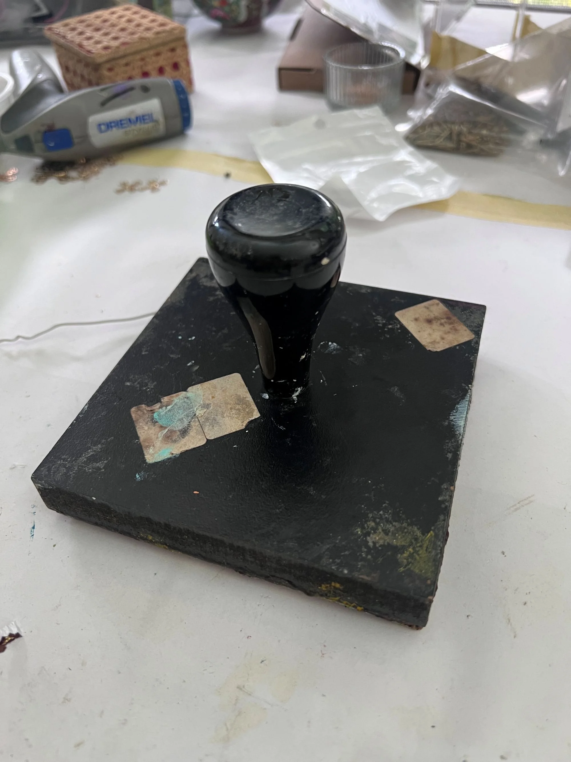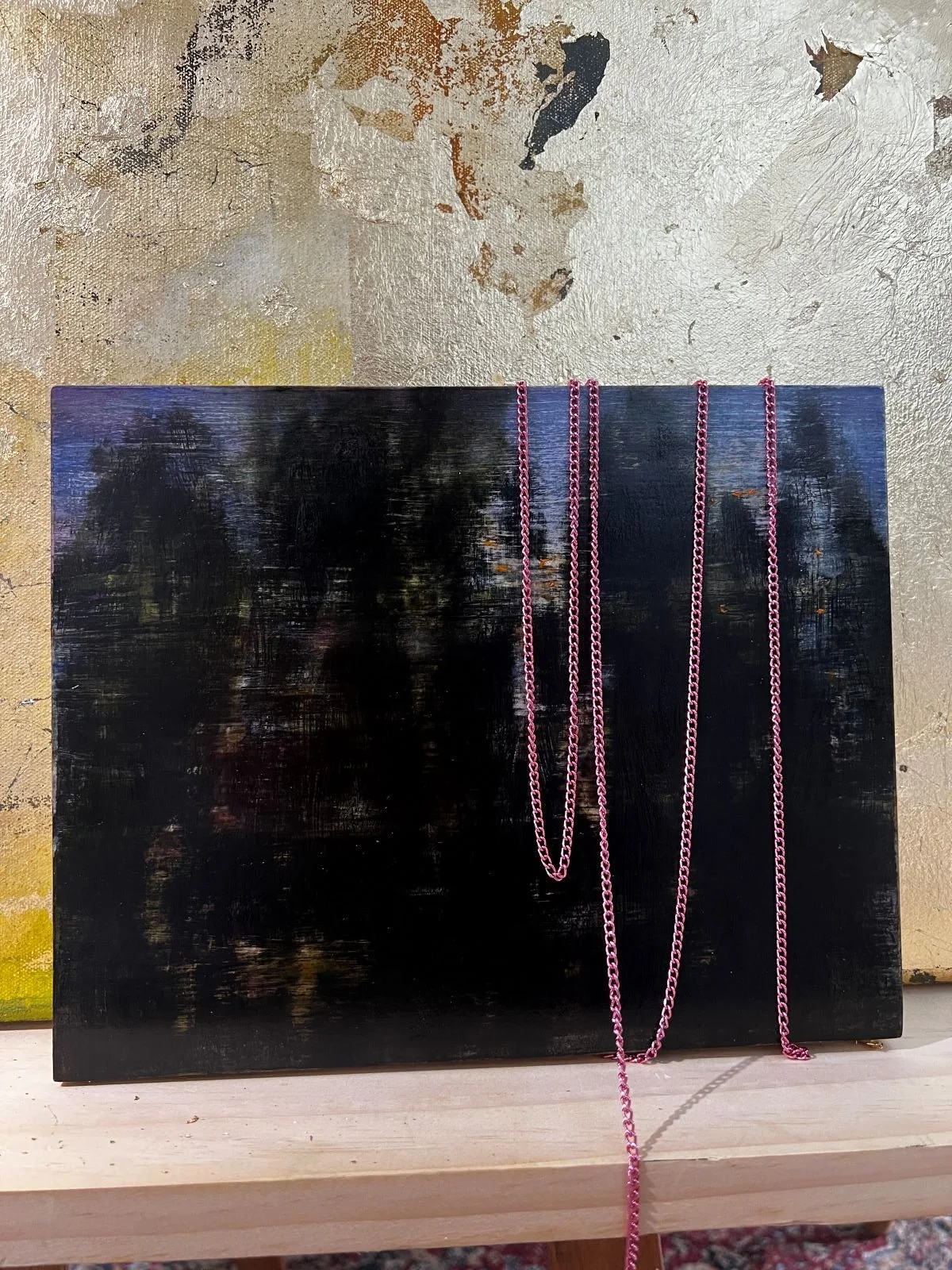 I don’t know but I have shifted the whole configuration of the studio, which was largely set up to make my beautiful products and I have bigger artworks in progress. Below is one piece I systematically destroyed which was great. It was an awful painting but breaking focus on jewellery in a flamboyant manner