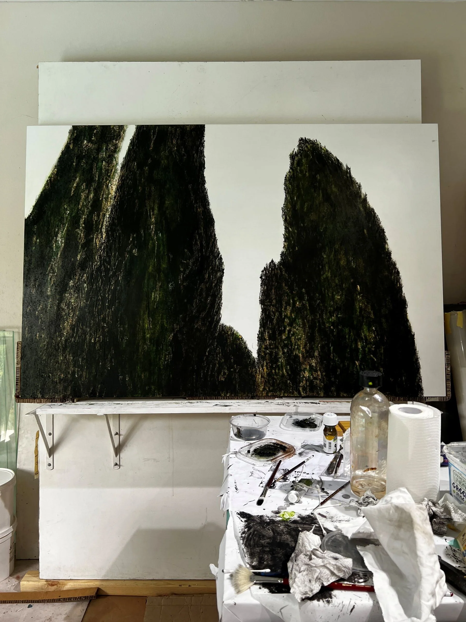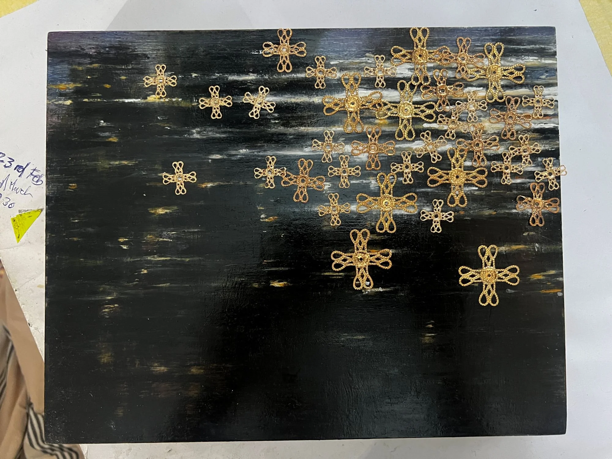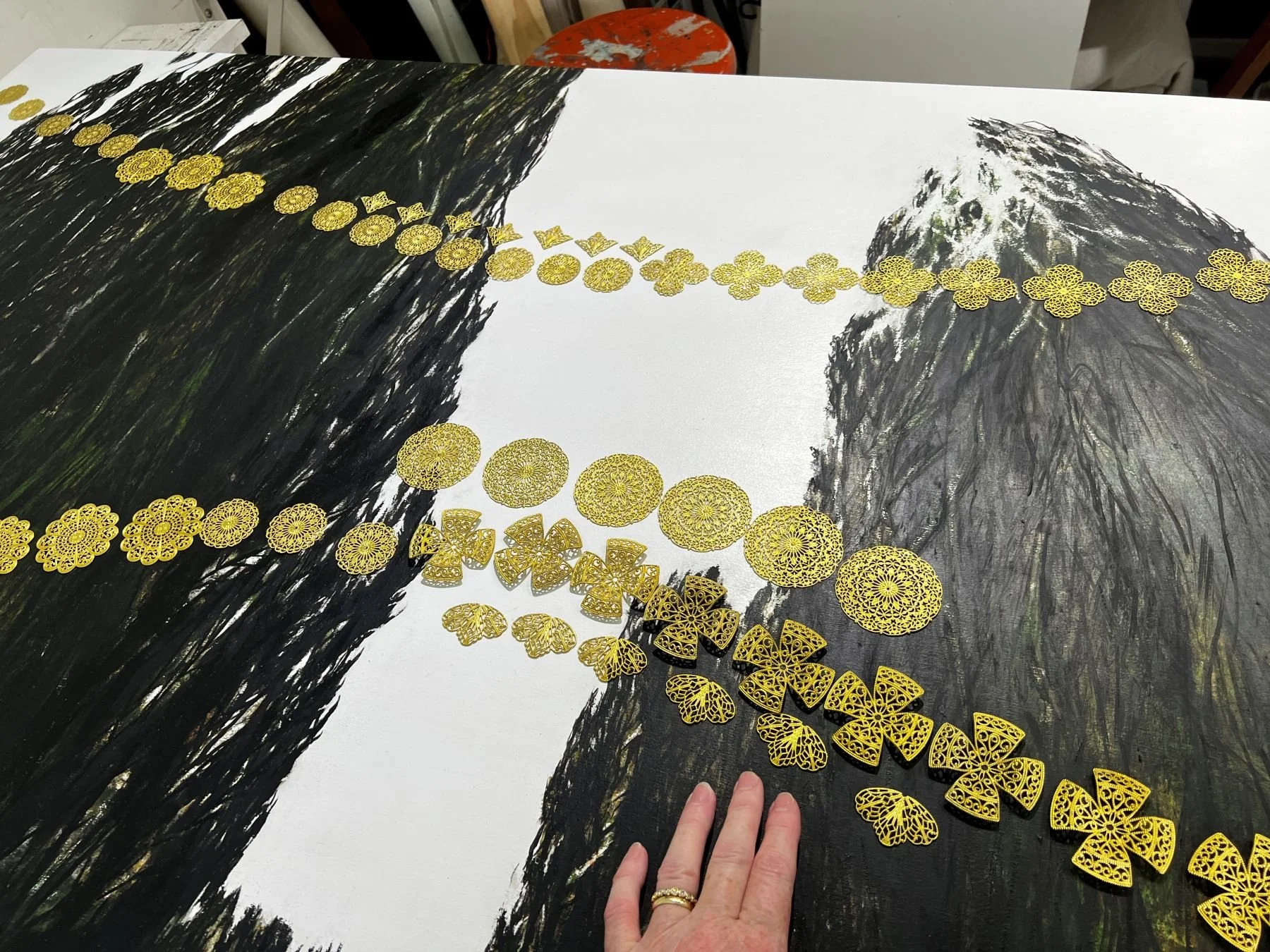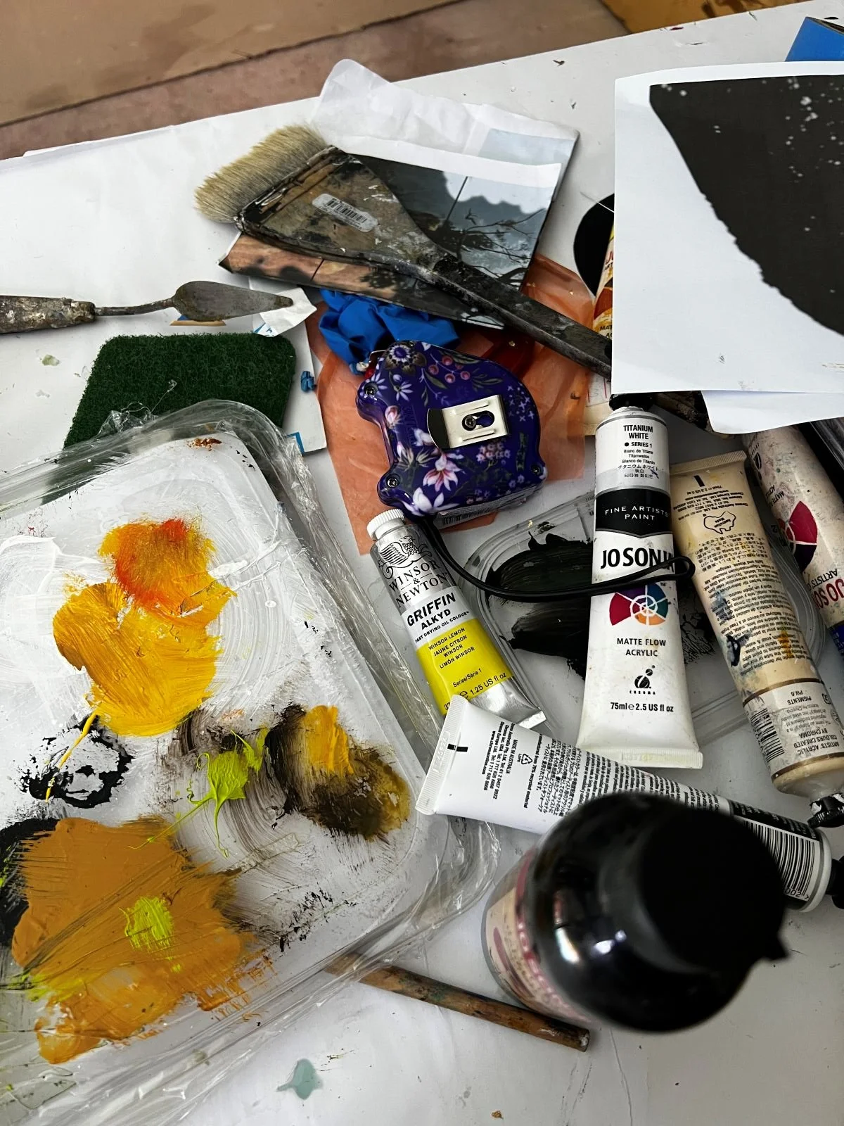 I don’t know but I have shifted the whole configuration of the studio, which was largely set up to make my beautiful products and I have bigger artworks in progress. Below is one piece I systematically destroyed which was great. It was an awful painting but breaking focus on jewellery in a flamboyant manner