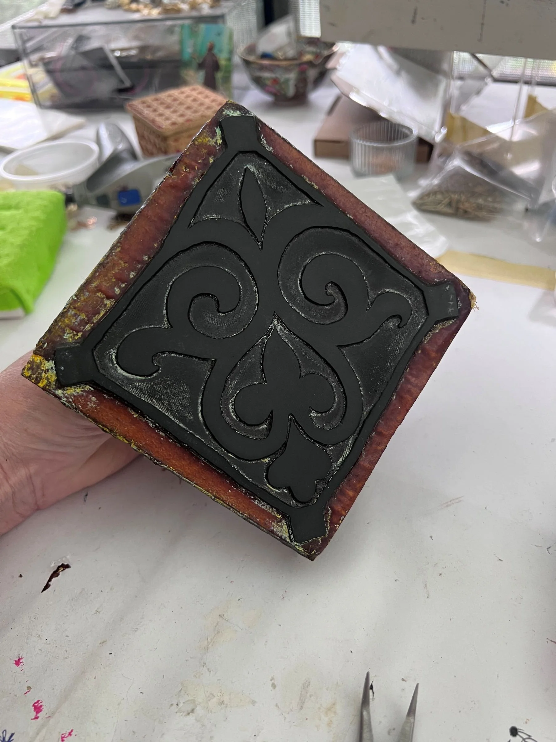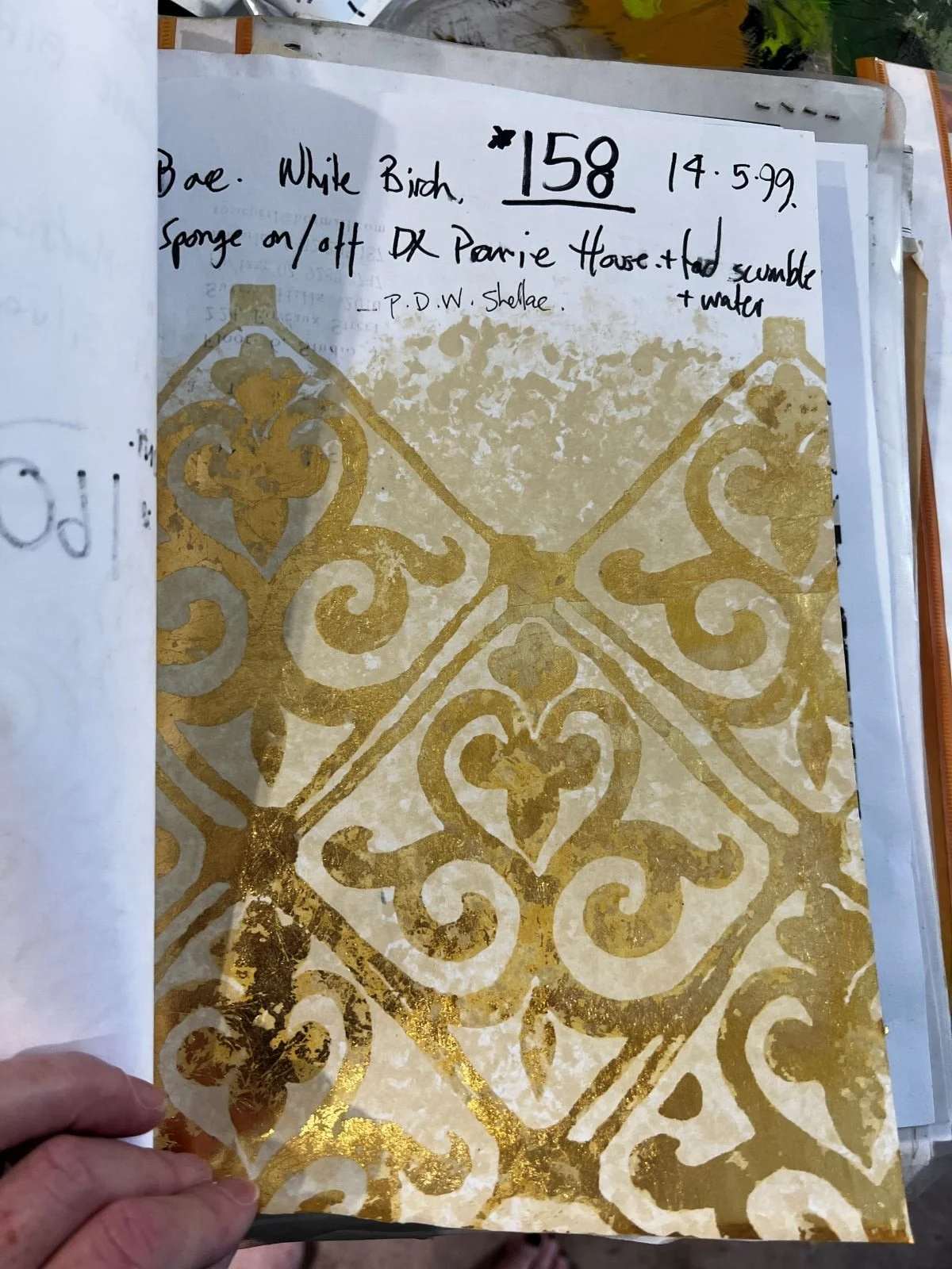 We’ve been doing some deep house cleaning and I came across a folder stuffed with recipes for painted finishes, this having been my livelihood for years. This one was for Sydney City Tattersalls which was a prestigious job in 1999 and would be still. I made a rubber stamp with this fleur-de-lis style design, taken from a scrap of antique fabric in the possession of the interior designer. I used the stamp to print the loose fabric repeat, as seen above on a spongey painted finish but in the end, I printed with size and gilded this pattern on tinted mirror ceiling panels.… It actually looked fantastic but I cannot find photos or anything about it online as before digital times.