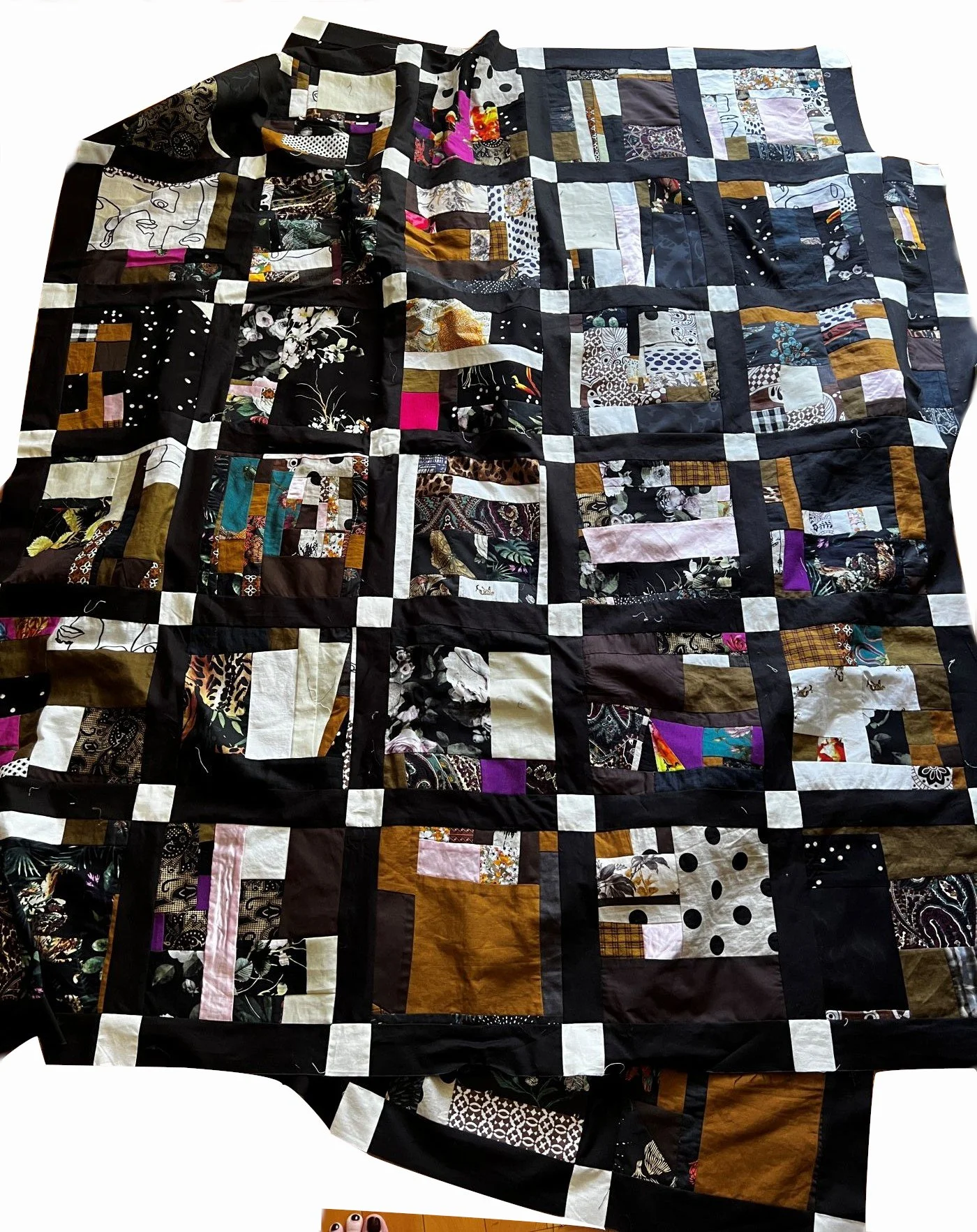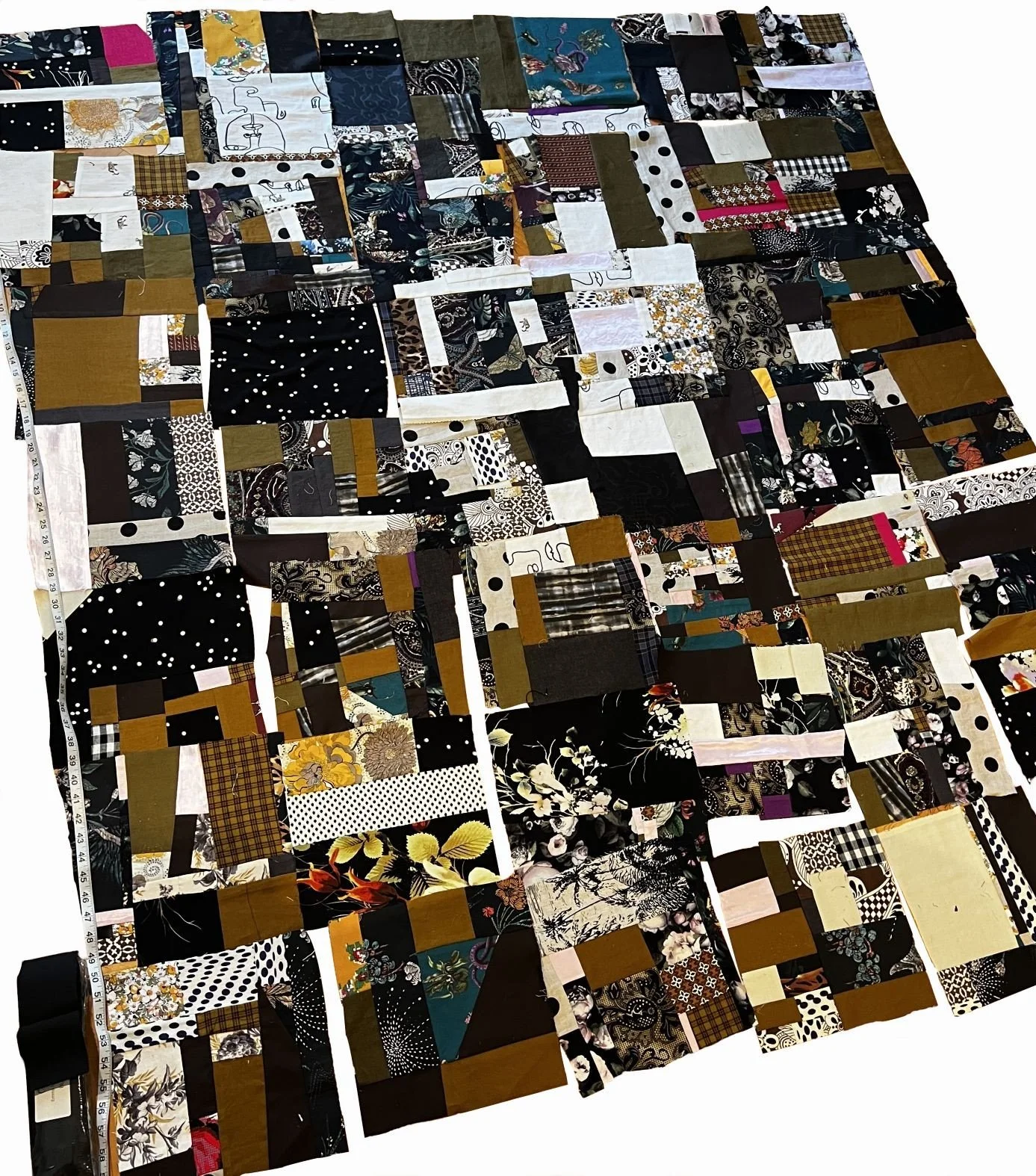 Now I’m just finishing sewing 6 borders around all them and then it goes to the long-arm quilters to quilt, where a woolly batting is sandwiched between this ‘top’ that I’ve made and a backing fabric I will buy, via all-over stitching, which makes it into what we then call ‘a quilt’.