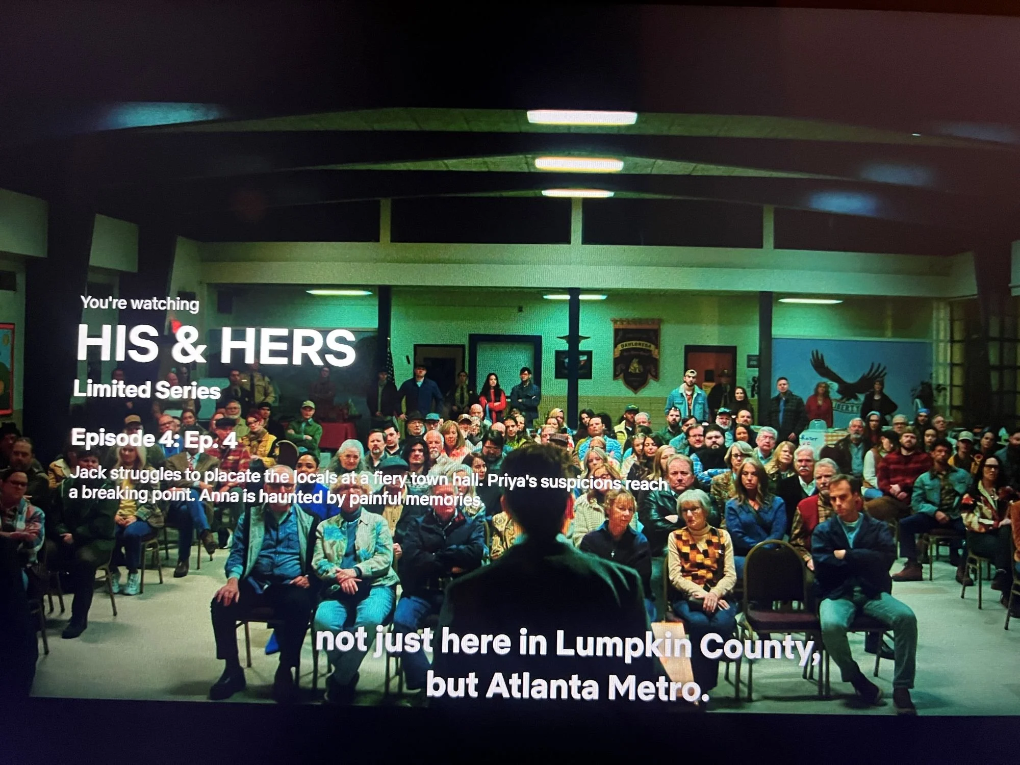 The underwater mood here, all greens and blues, dark filter. This is called Stylised Colour Grading and its a job (John tells me) and “generally the aim is for colour grading to enhance the story and message but not be noticeable”. As we can see, very noticeable here in a murder mystery set in the deep south of USA, and that country at large is sinking into the deep, so that tracks