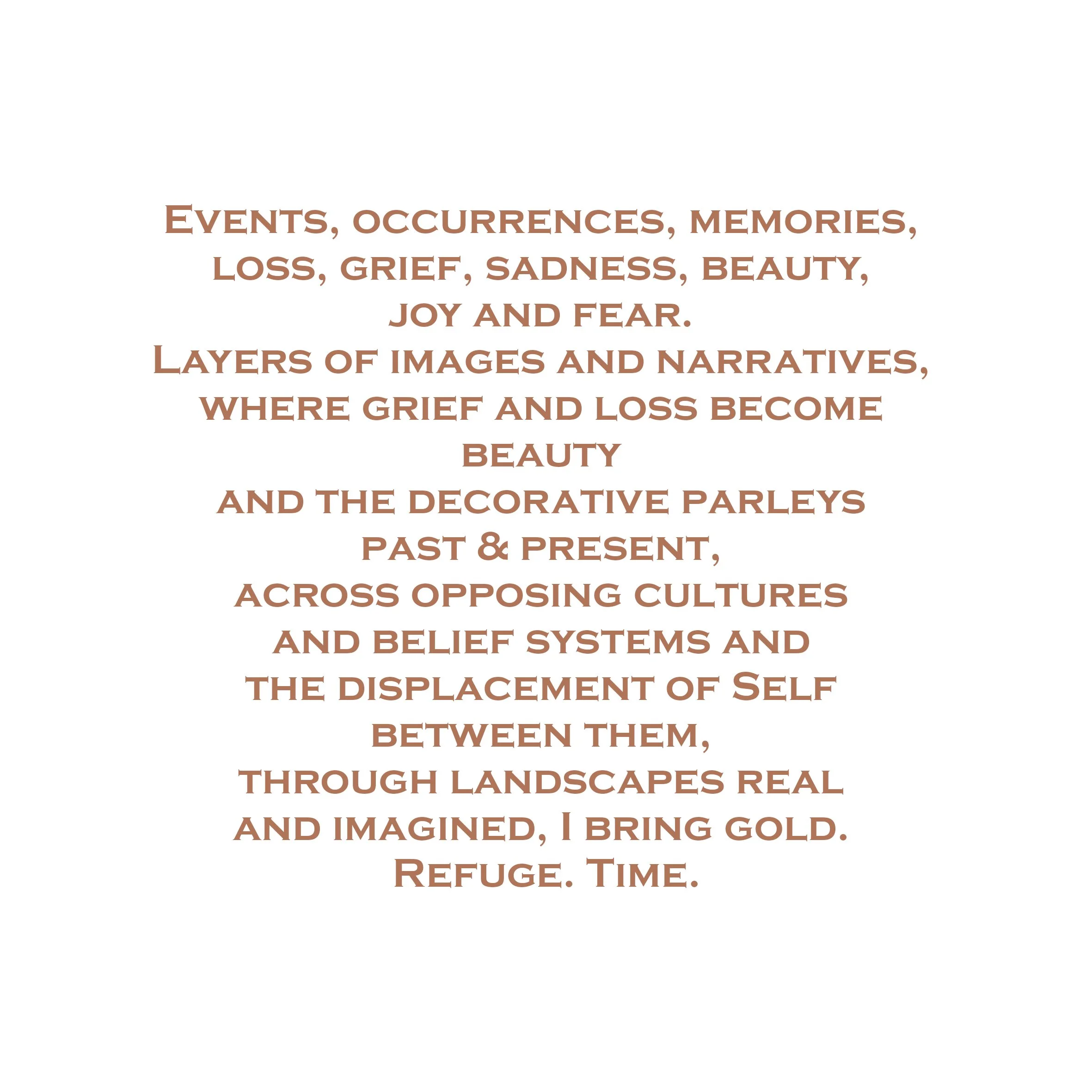 After the Rain #3Oil on canvas, 22 carat & 12 carat white gold leaf, aluminium and composite metal leaf, oil size““After the Rain” refers to memories of the nightly tropical thunderstorms in Bogor, West Java, and the mirrored landscape to the periods in my life that came before, and after, we lived there, with my father’s sudden, shocking death having caused us a new life in Australia. There was definitely a before and after. Even though I was the same person, I never matched up. The schism was profound and I’m still chasing it. West Java is an incredibly beautiful place, my Camelot, and 12-year-old me found the Brisbane suburbs a very far remove. But enough of the tropics remained so that every time it rained, I felt connected to something that I’d lost but I couldn’t catch it in my hand, it was quicksilver.” Manifesting time by the acts of multiple gestures, smudges and paint strokes, the countless layers combine to identify a landscape, to almost carve an image onto canvas in a bid to create it’s “proof”. The materiality of chosen media – oils and gold leaf - construct a densely worked but delicate surface, where the adding and subtracting successive observations of a digital image creates a patina, the very definition of time.